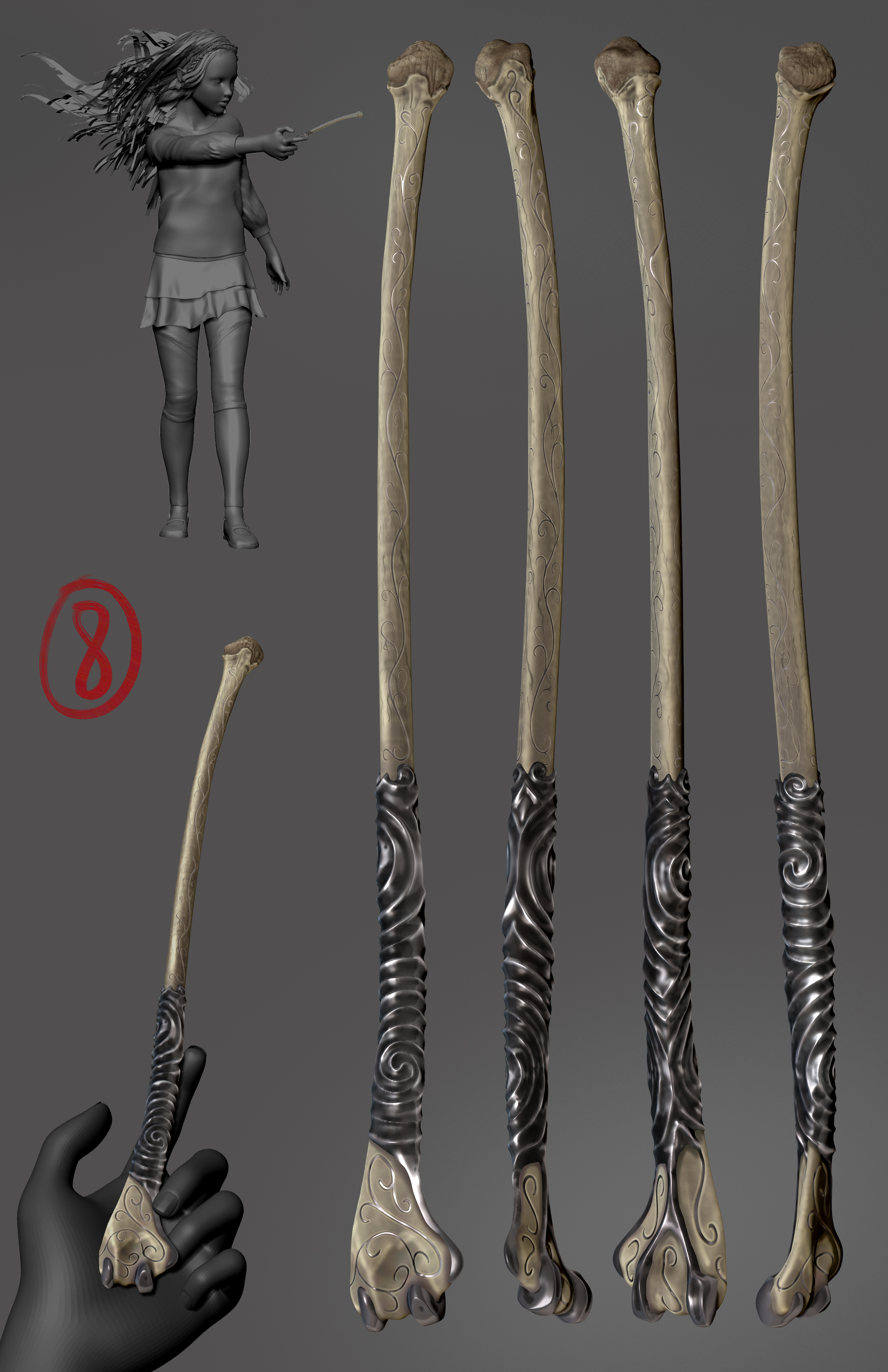 The wand was challenging to design to avoid it from looking too much like a prop out of Harry Potter. The idea was to make it look like it was made from a bone from an ancient powerful wizard (or Bright). A functional catholic relic.