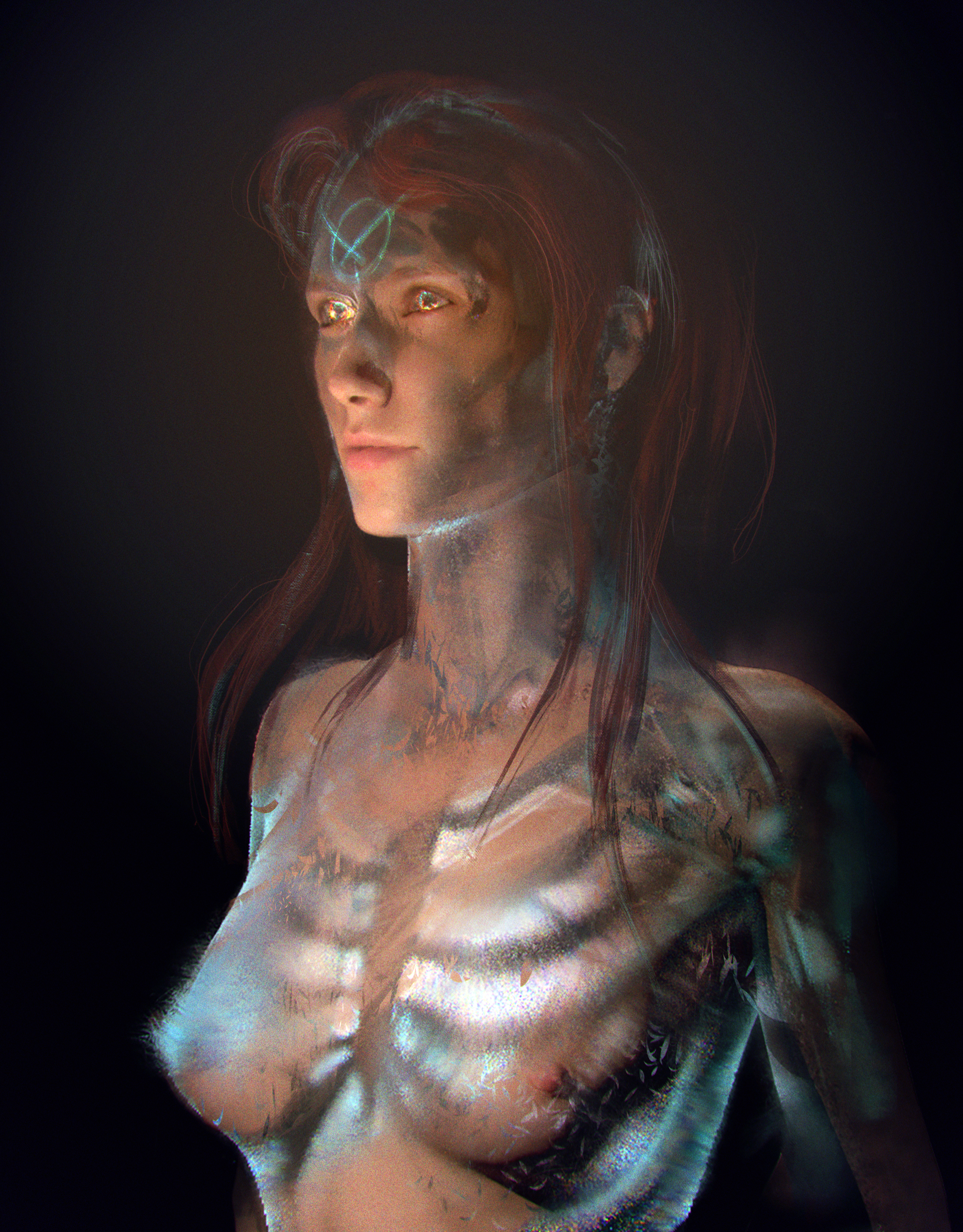 The dual being idea was abadonned in favor for pursuing the idea of an aparition. A ghostly remnant of the witch’s corrupted being in this reality. In the software, render times were really long with layers of transparency and diffraction effects, but Modo’s progressive preview renderer allowed for quick iterations anyway. There’s something compelling about the pixelation of under-resolved areas.